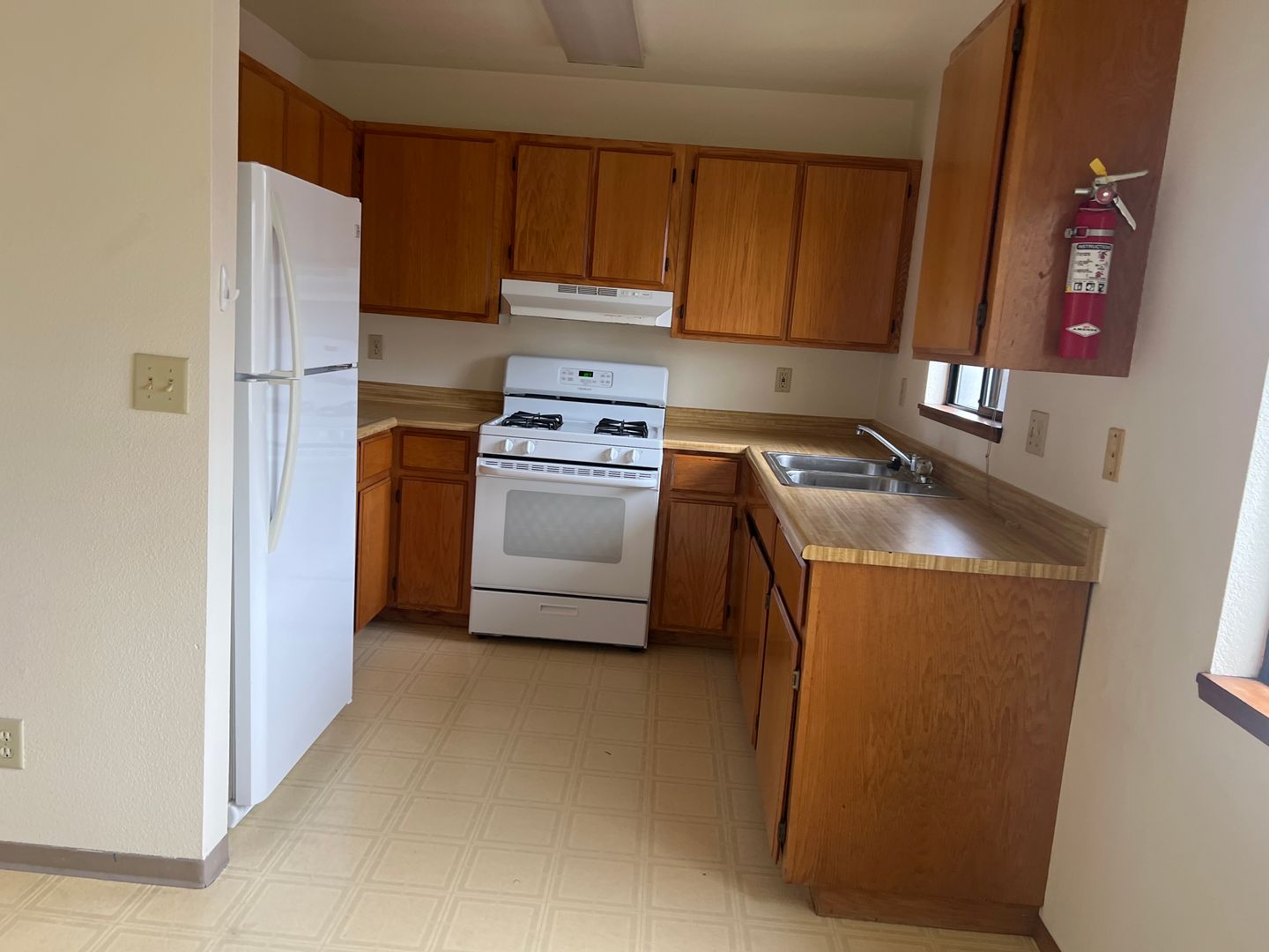 Kitchen includes stove, refrigerator, space for a table