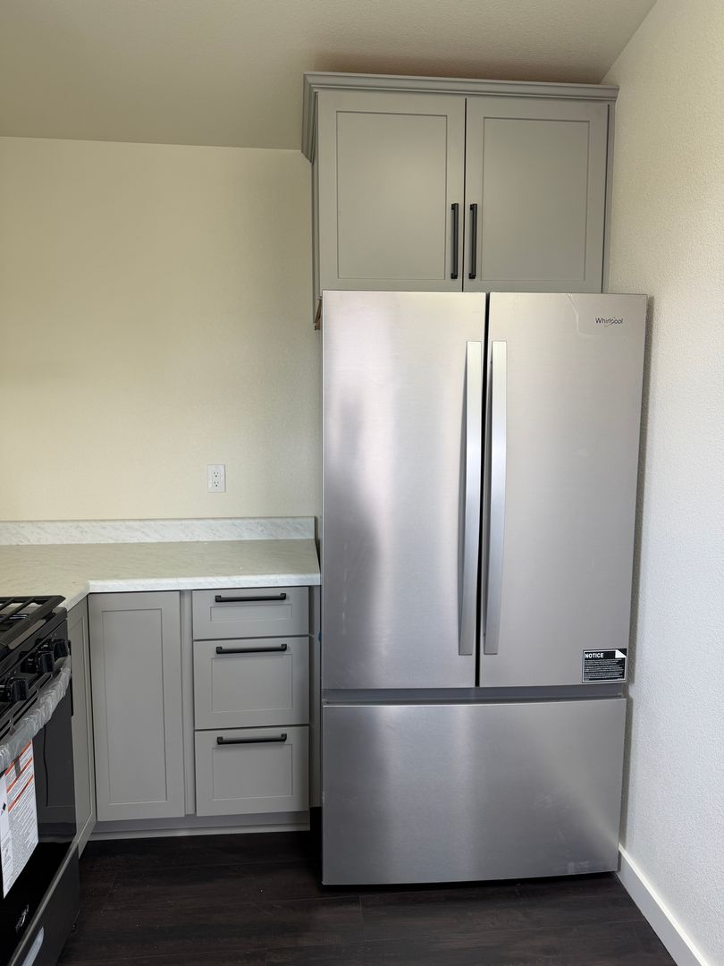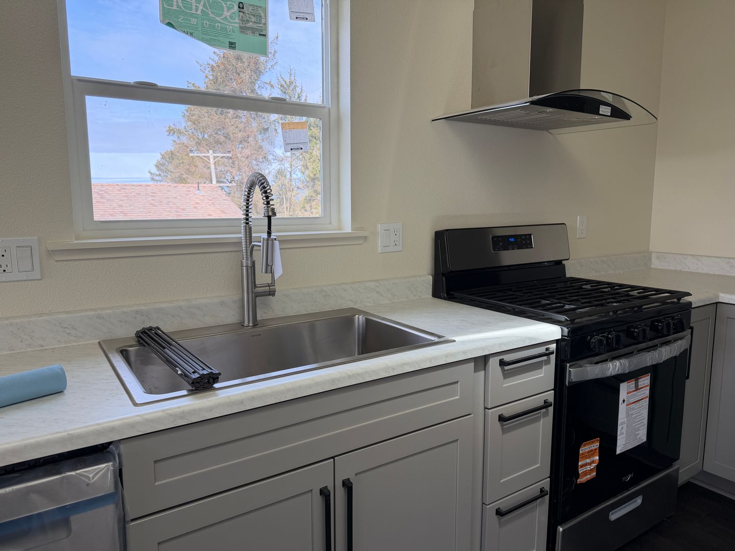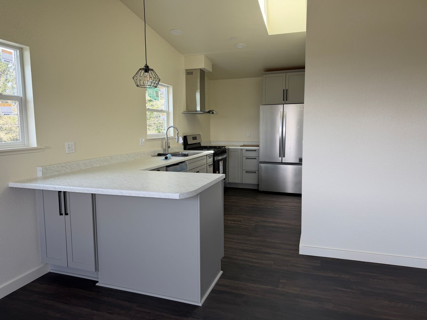 Kitchen-Farm Sink, Stove, Side by Side Fridge Dishwasher, Breakfast Bar